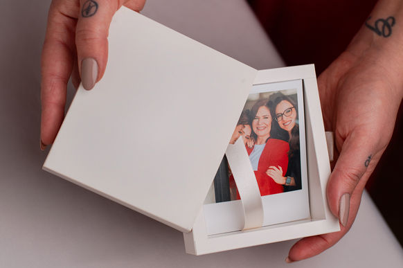 ✔️ Uma caixinha especial com as fotos do pacote escolhido em Polaroid com ímã pra grudar na geladeira mesmo, que é o altar de toda casa brasileira.